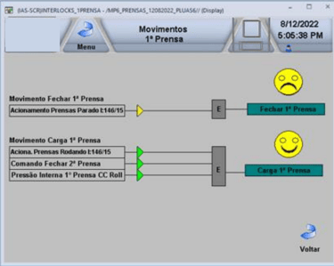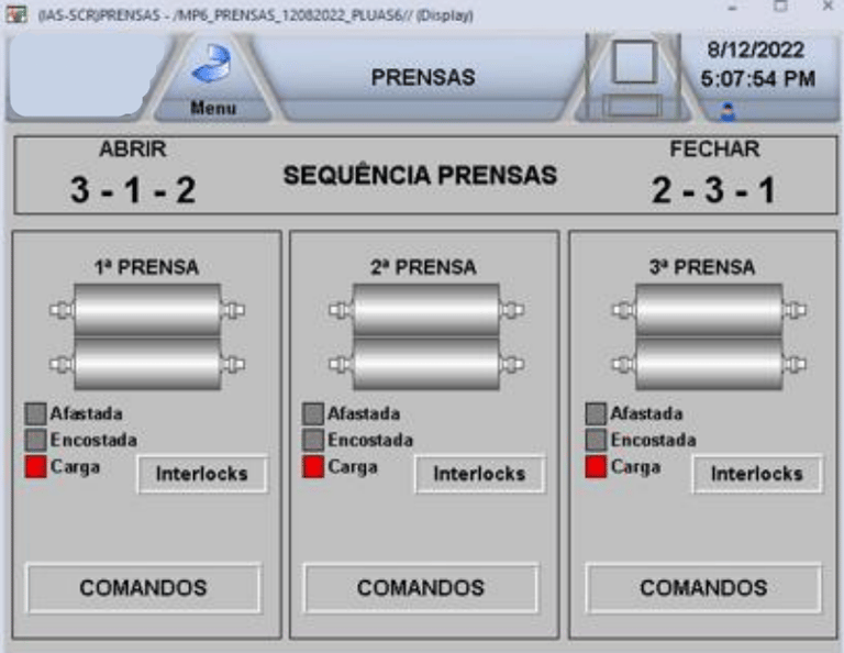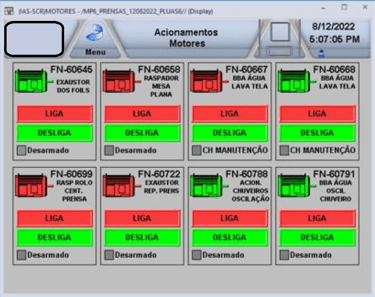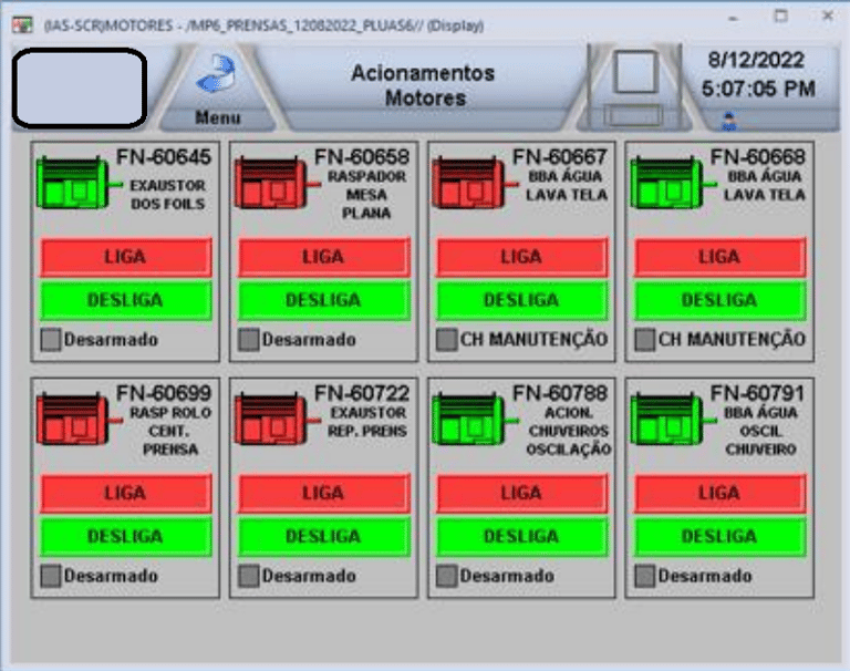 O antigo sistema em questão contava com botões físicos de comando elétrico 110Vac, com repetidas falhas de acionamento indesejados e não realizados que afetam o OEE, instalados duas IHM redundantes PanelView 7 Plus comunicando Ethernet/IP com Gateway Prosoft e PLC5/60. Com isto melhoramos a questão de falhas indesejadas, criamos históricos de alarmes, tela de interlock de acionamentos e uma redução de custo por volta de R$140mil em rack de PLC5/60 visto que os comandos estão na IHM e trocando mensagens CIP, não sendo necessário cartão de entrada digital no Rack no PLC.