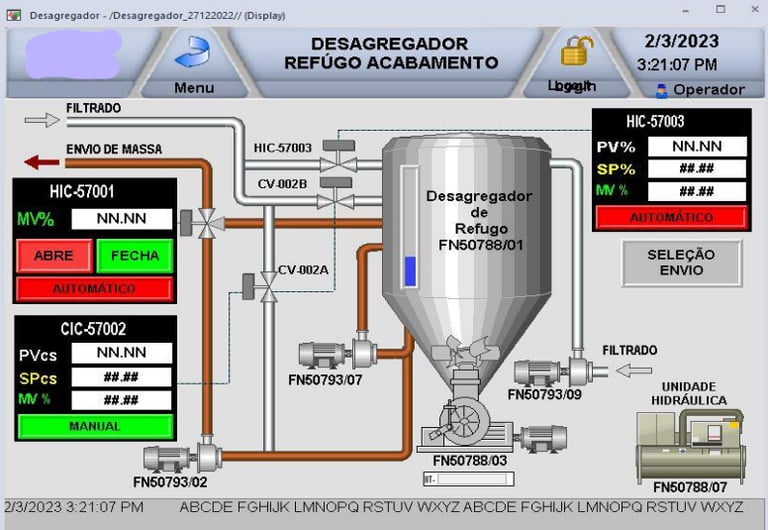 Projeto Retrofit Desagregador de Refugo, processo baseado em desagregar papel branco de refugo, fazer adição de água junto ao controle de consistência de massa da polpa e controlar envio da polpa para seus tanques destinatários. Foi retirado controladores Smar CD600 descontinuados do mercado e instalado o moderno MicroLogix850 e IHM PanelView 7PLUS da Rockwell Automation contando com malhas de controle PID, trandutores I/P, transmissores de nível e consistência, relés de interface.